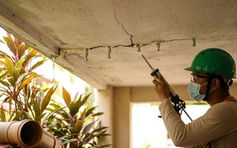 Polyurethane injection seals active leaks through concrete cracks in roofs, slabs, and walls.